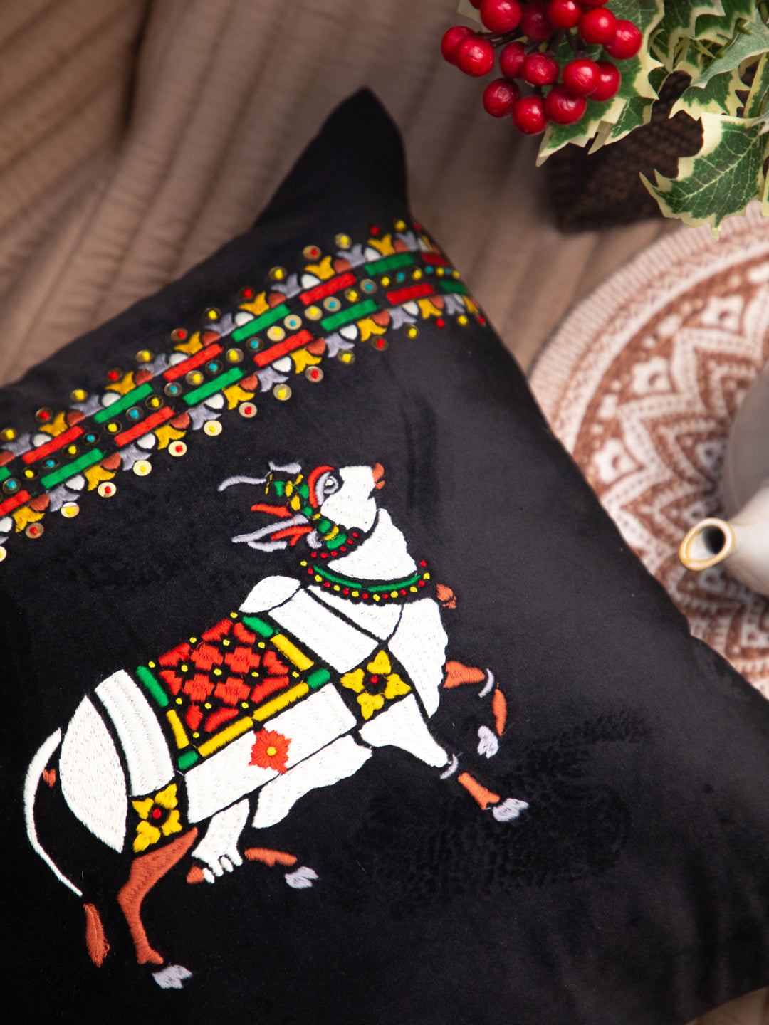 Black Velvet And Animal Print Embroidery Square Cushion Cover