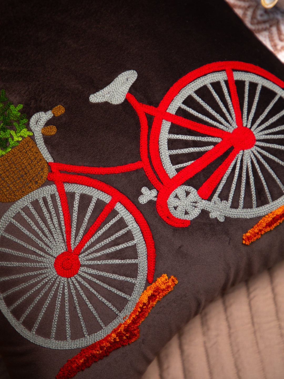 Dark Brown Velvet And Multi Color Embroidery Printed Square Cushion Cover