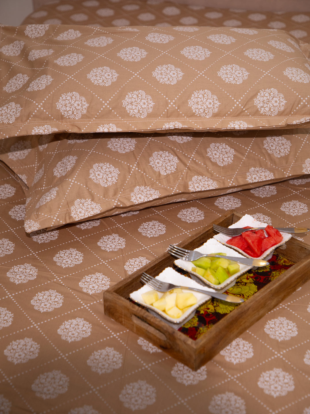 Tan Base White Motif Print 100% Cotton King Bedsheet With Pillow Covers