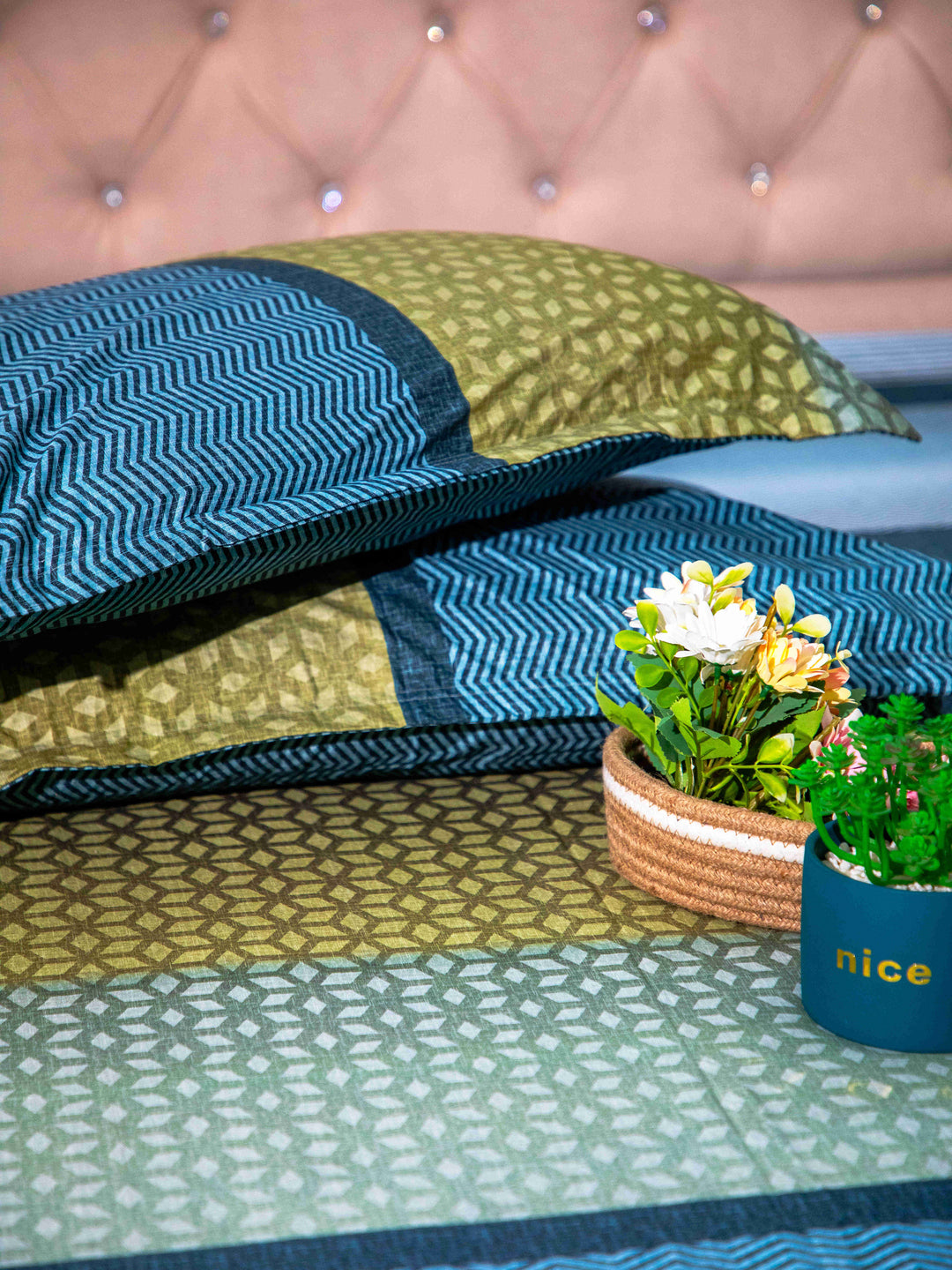 Turquoise Graphic 100% Cotton Bedsheet With Pillow Covers